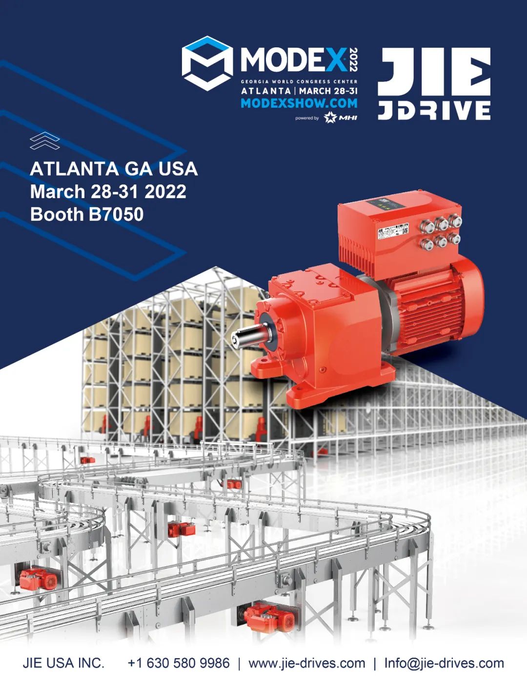 2022年3月28-31日,杰牌美國公司亮相美國亞特蘭大運輸物流MODEX展覽會,運輸物流行業(yè)—杰牌智能傳動方案提供商。